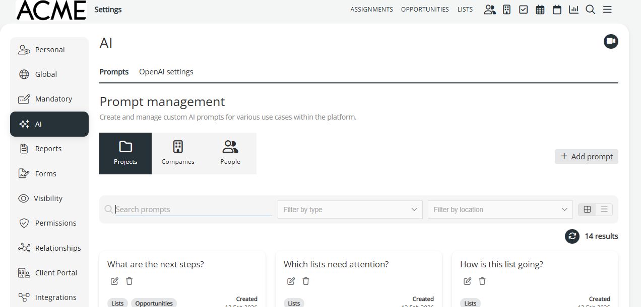 To update your prompts, the administrator should navigate to settings, AI. There are tabs available for Projects, Companies and People records.