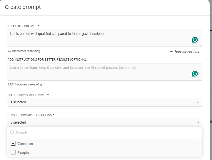 When you add or update a prompt, you will have further options regarding the particular project type to use, and on which pages the prompt should only be available on.