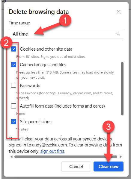 On most browsers, it is Shift+Ctrl+Delete to get to the function that does this (MAC browsers are Command+Shift+Delete). The next panel varies depending on browser, but you only need to clear the items shown below, for ‘All Time’ (1).