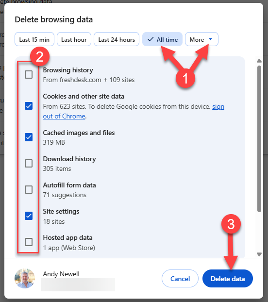 Make the options in the panel look like this in your browser (2) and then click the icon (3) to clear the data:
