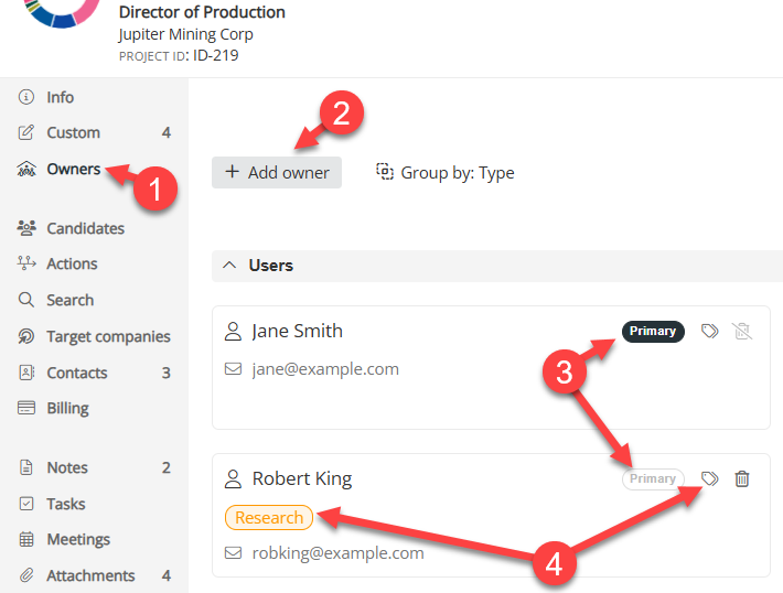 The primary record owner is the person responsible for the record (by default, this will be the creator of the record). You can change the owner on the 'Owner' tab on the left of the page in Project, Company and Person records. You can have multiple owners tagged with different values, but the primary owner is the master owner.
