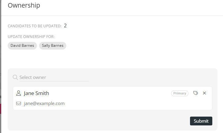 Select the new owner on the next panel. You can opt to make them the new primary owner and add a tag. If you change the primary owner like this, the former primary owner will remain as an owner, but will no longer be primary.