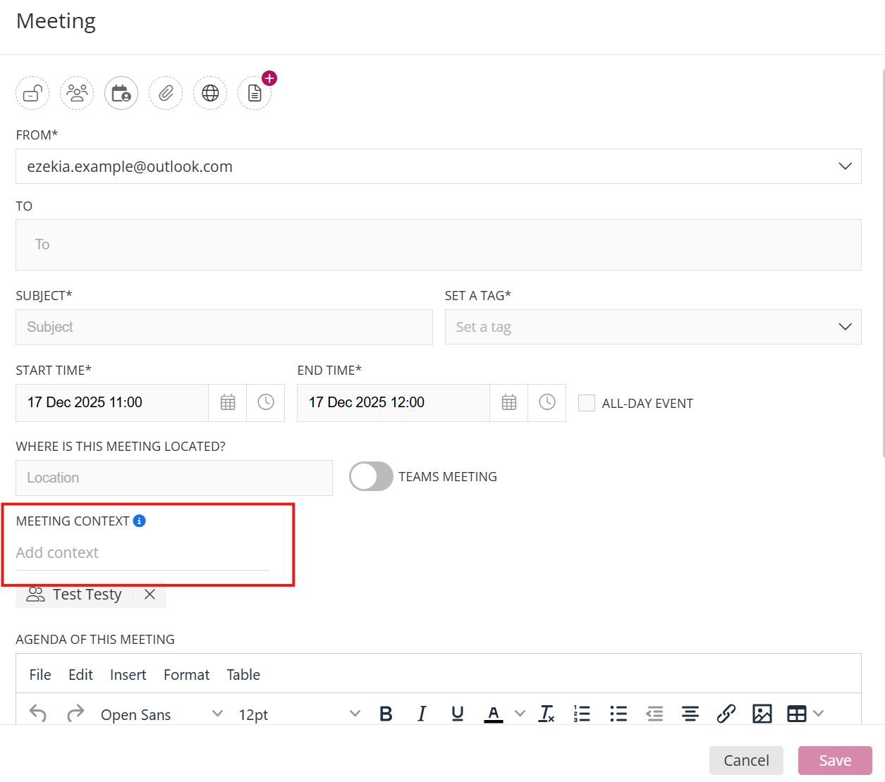Context in the meeting is most import for linking a meeting to a particular Ezekia record (Person, Project or Company) whether is has been sent out to someone or not. Just enter whomever you need to link to the context box here: