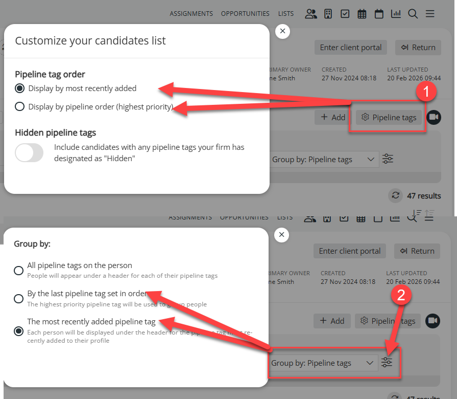 This is probably a settings issue – most likely, you need to display the ‘Most recently added’ (The most recently added pipeline tag) pipeline tags rather than the ‘Highest priority’ (By the last pipeline tag set in order) or 'All tags' (All pipeline tags on the person).