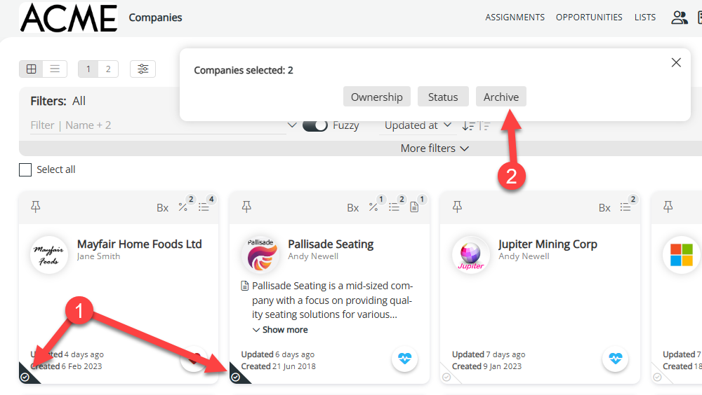 - You can archive multiple company records by selecting them on the company list page and clicking 'Archive.'