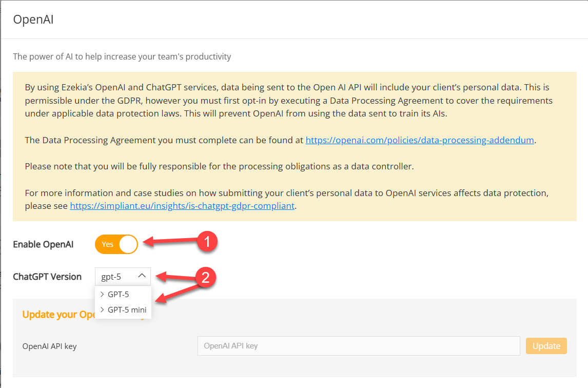 Once you have a subscription, the administrator can enable OpenAI and choose in Ezekia which GPT model to use (see below). Ezekia AI features only work with models in the GPT-5 range or later. To help you choose between the two options, GPT5 is more expensive but can produce better results, whereas GPT-5 mini is much cheaper but may require more prompting to get desired results.