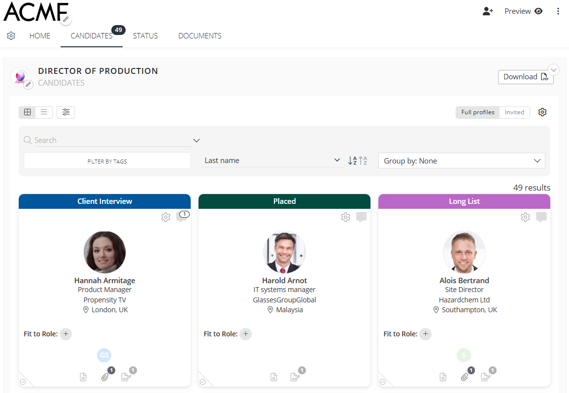 The client portal includes a landing page, which can be fully branded by you. The candidates page shows a list of candidates on the assignment, but you can change which candidates are visible and what information about them is shown to the client.