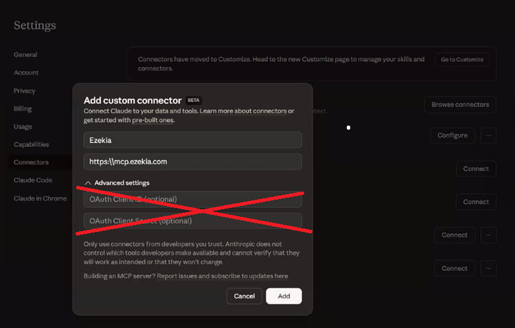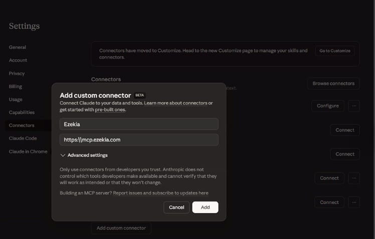 Add the Ezekia MCP Connector in Claude